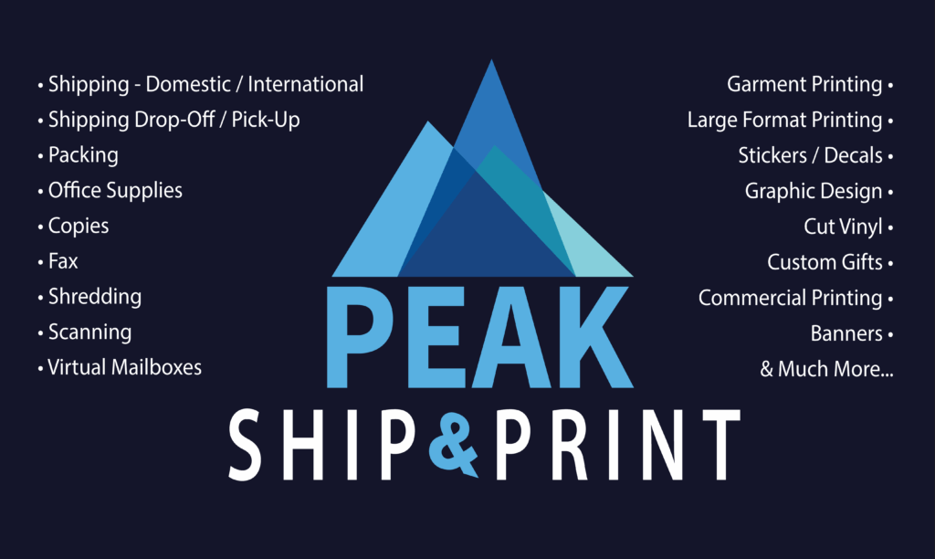 We can pack and ship nearly anything to virtually anywhere in the world, but our services go beyond shipping to simplify your life. As Woodland Park’s leading custom commercial print shop, we handle everything from large vinyl banners to small pamphlets as well as create custom garments including t-shirts and tote bags. Whatever you need printed, Peak Ship & Print can handle it!